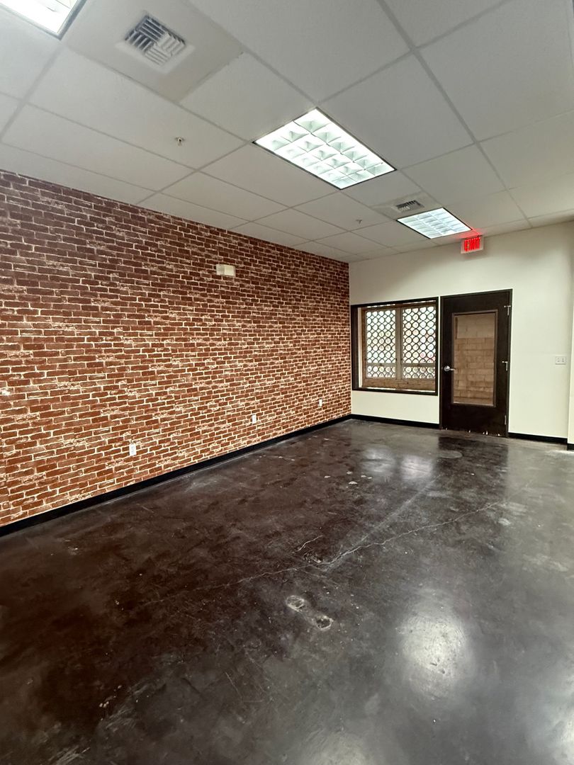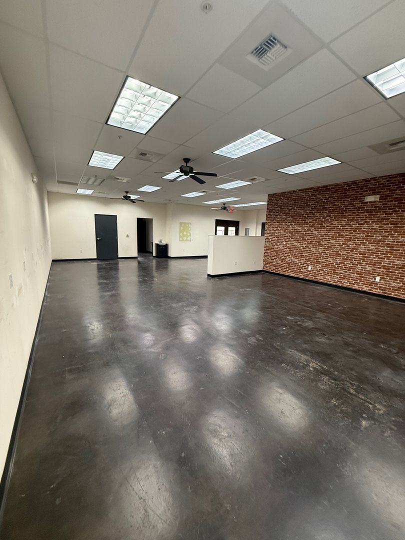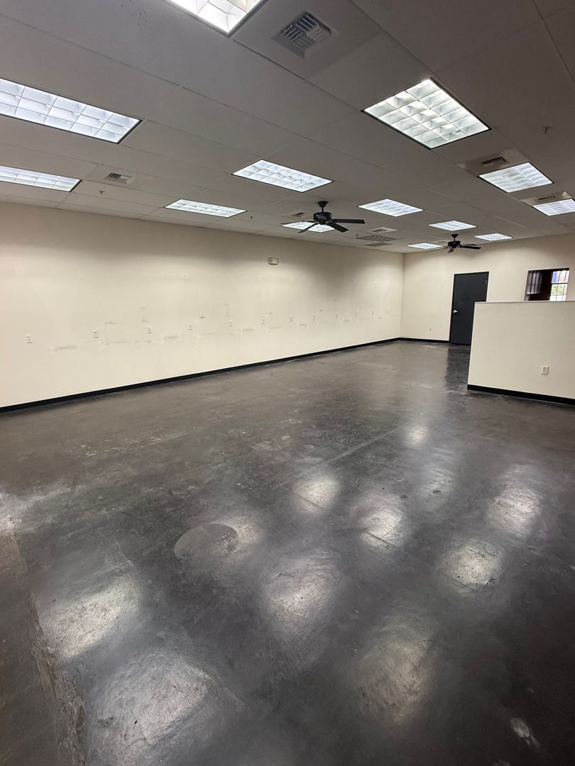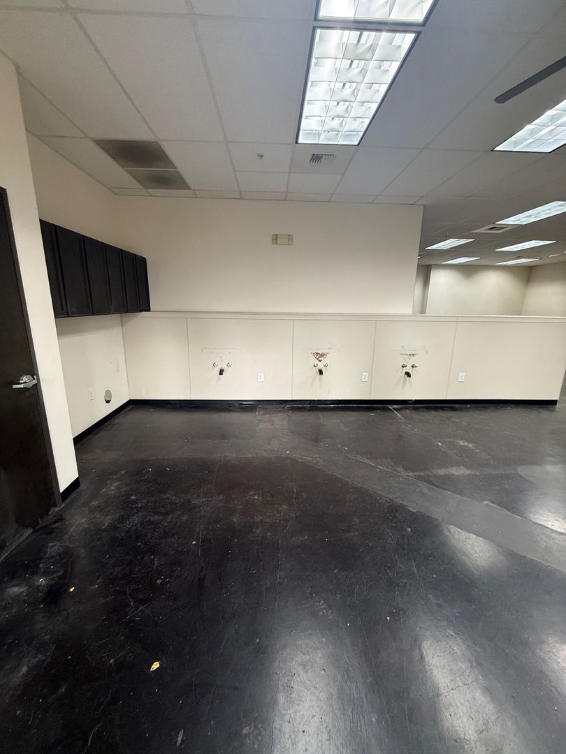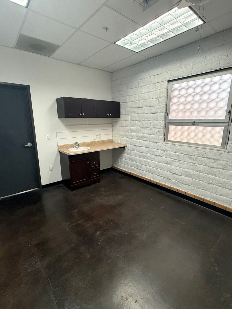 Spacious open suite with several utility sink hookups that are perfect for a spa or salon space! Concrete floors throughout with ample cabinet/counter space. Suite has access to shared kitchen/sitting area and private restrooms.