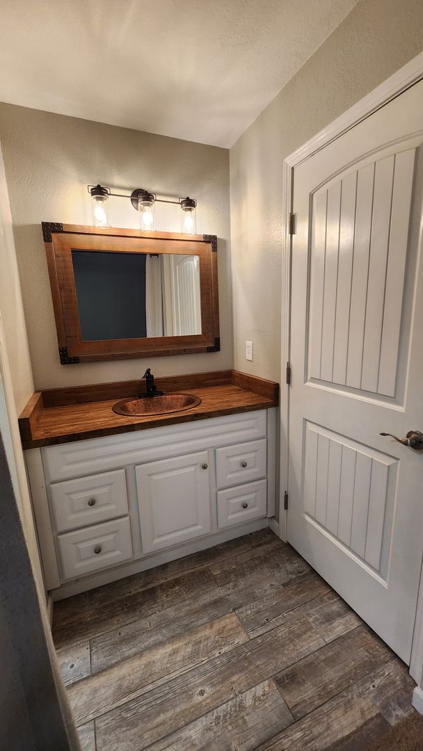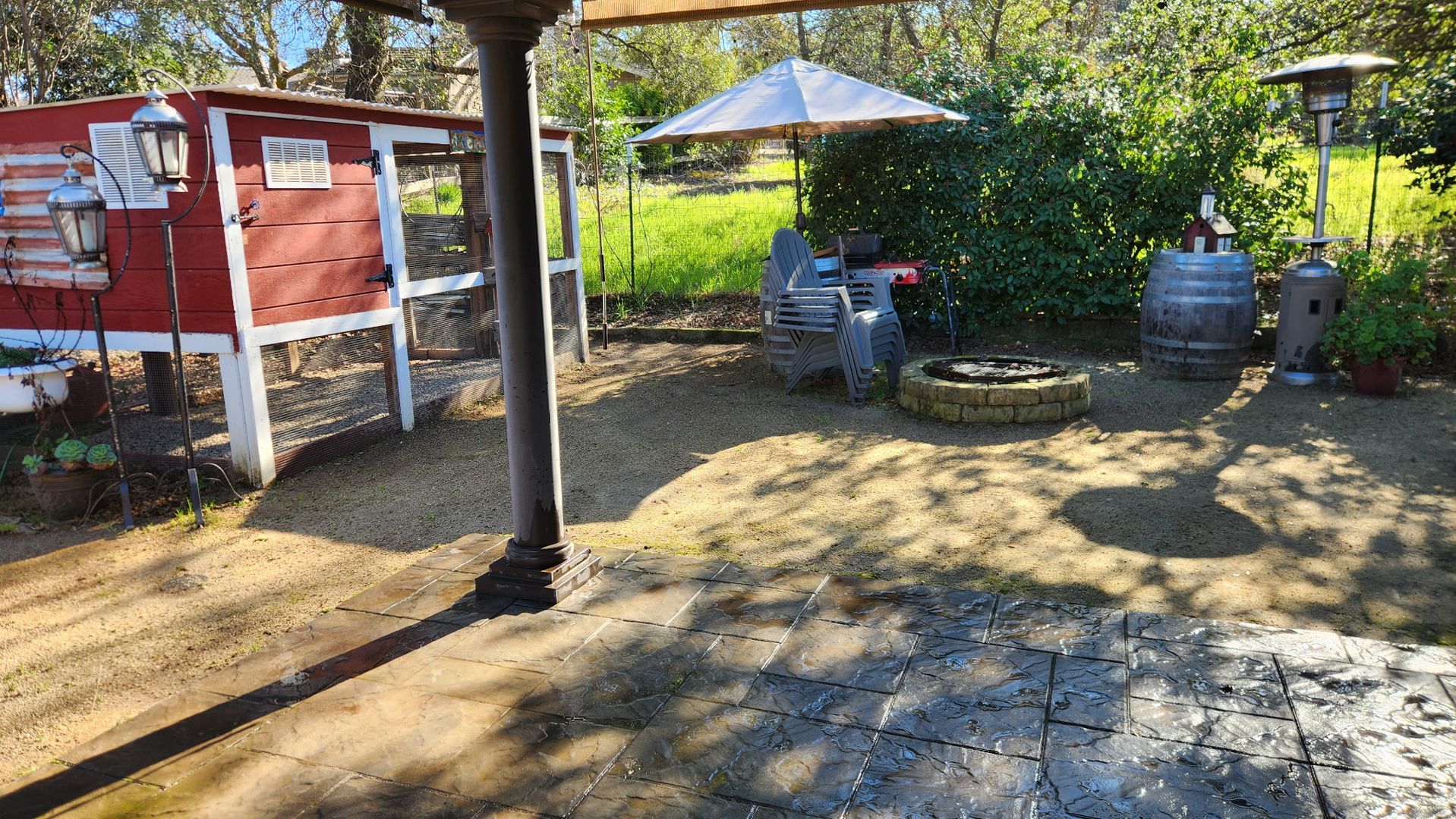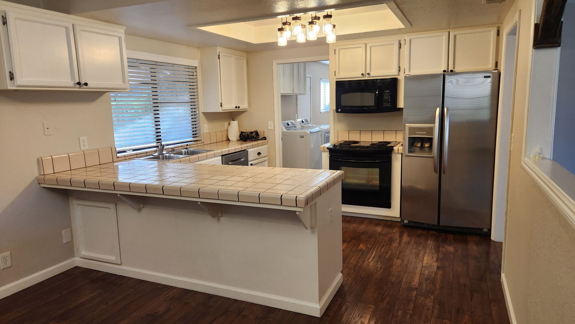 3 bedrooms, 2 bathrooms. Large kitchen with ample counter space. Clean white and black interior with hardwood flooring throughout. Central heat and air plus a wood burning stove. The backyard is spacious and charming, with room to relax, grill, garden, or enjoy the existing chicken coop setup. Landscaping service included.